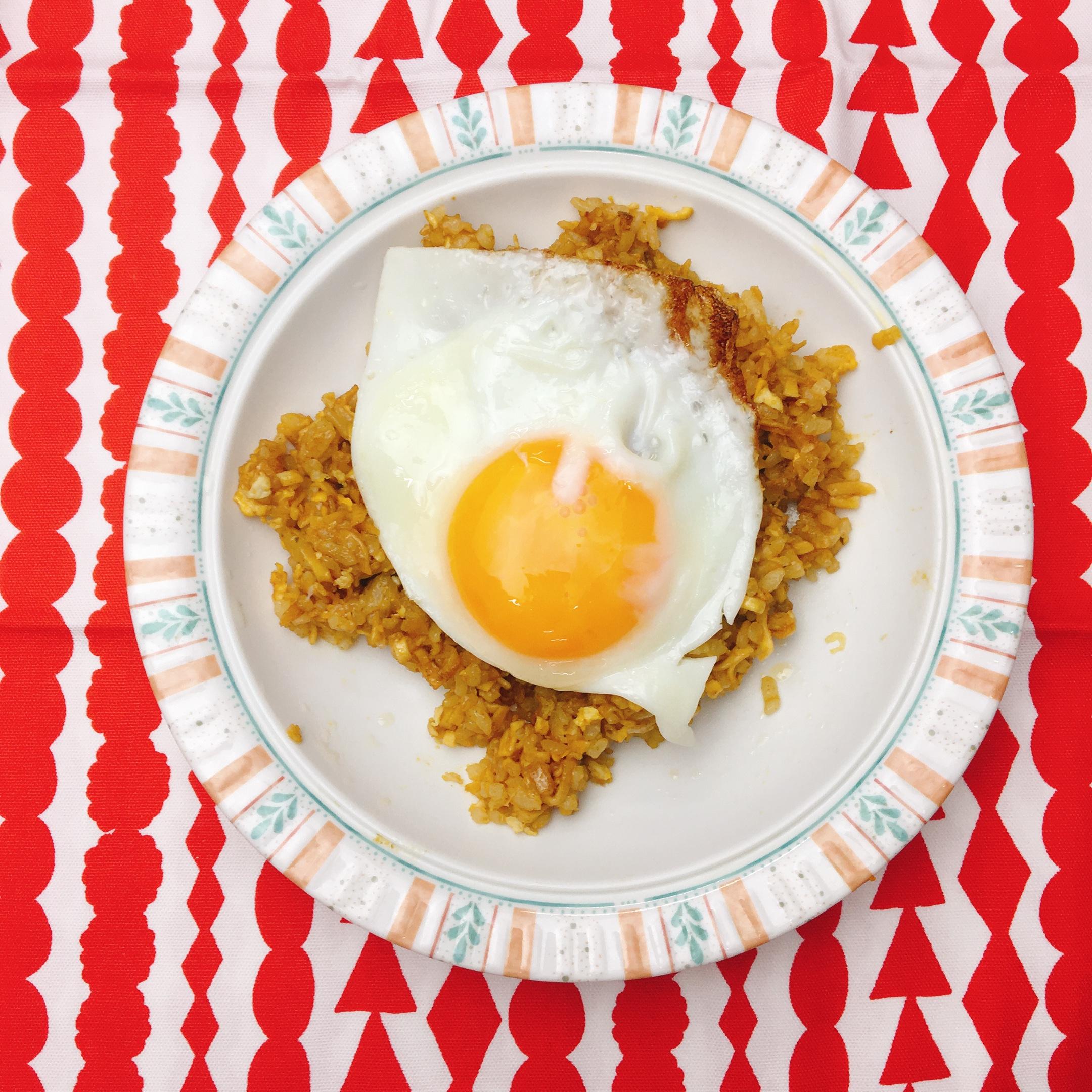②次に、油を引いたフライパンで溶き卵を炒める。そのあと、フライパンにご飯を入れ、卵と一緒にほぐす。