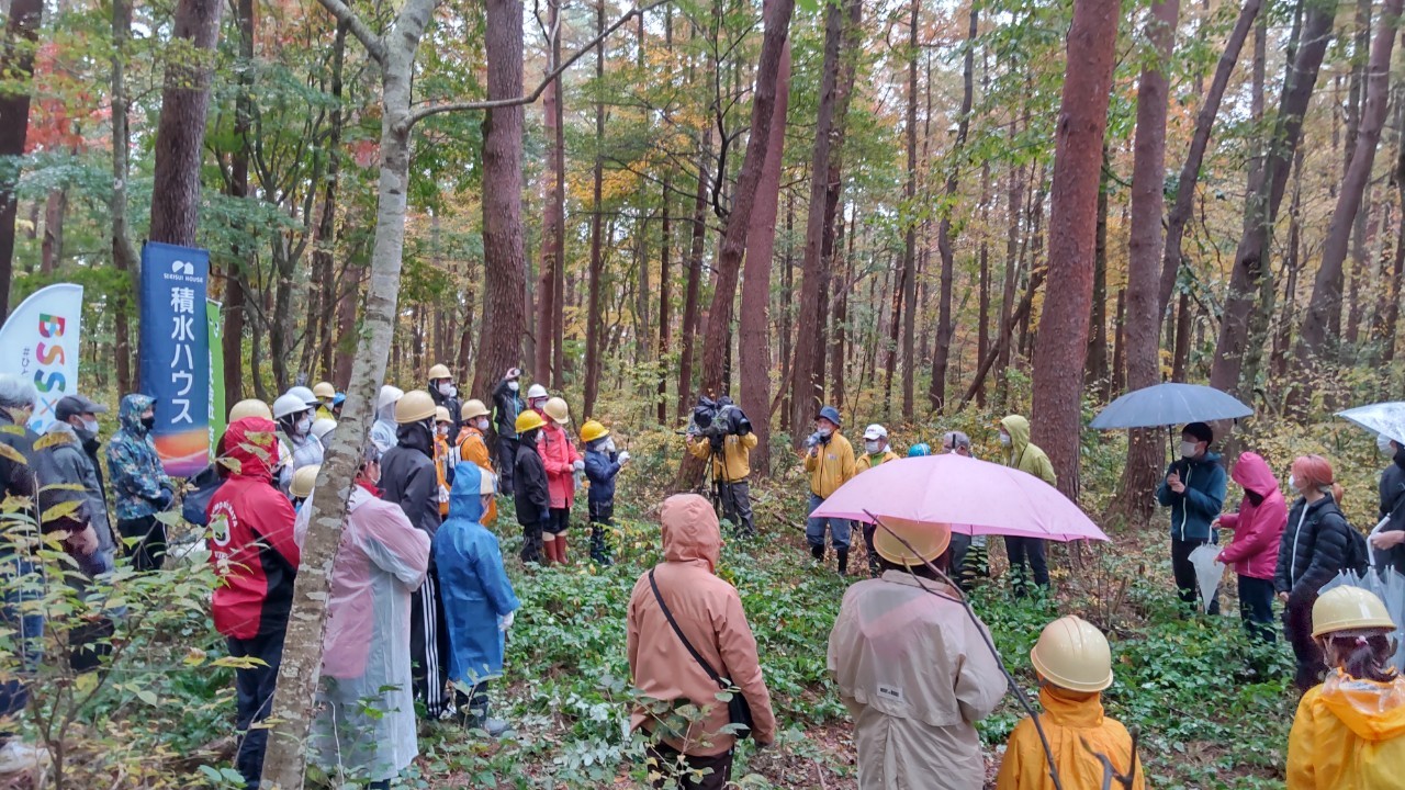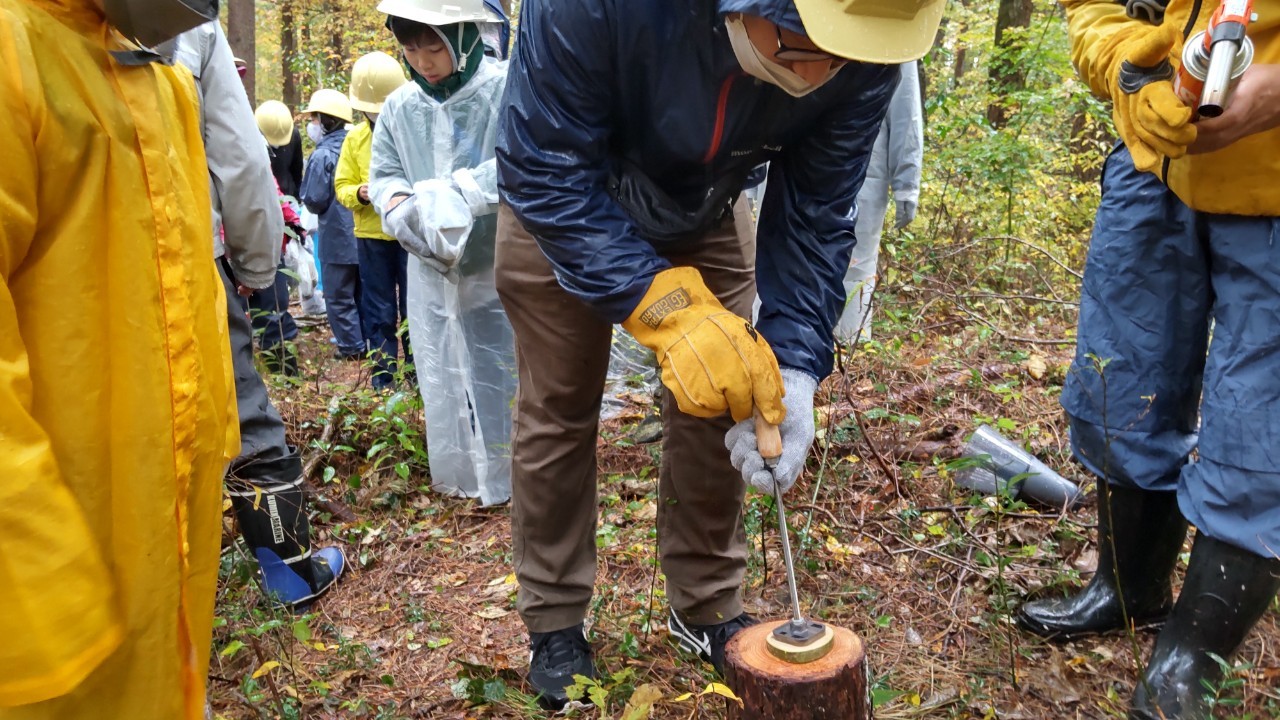 鳥取県内で環境保全活動に取り組まれているNPO団体「とっとり希望化計画21」に協力いただき、参加した親子約25名が枯れ木の伐採等の森を守る活動や薪割り、コースター作りなどの体験をしました。当日は雨で肌寒い天気でしたが、参加した親子は普段できない森林での体験に熱心に取り組み、島根大学松本教授や鳥取大学清水教授からの環境学習で、森の大切さを学びました!