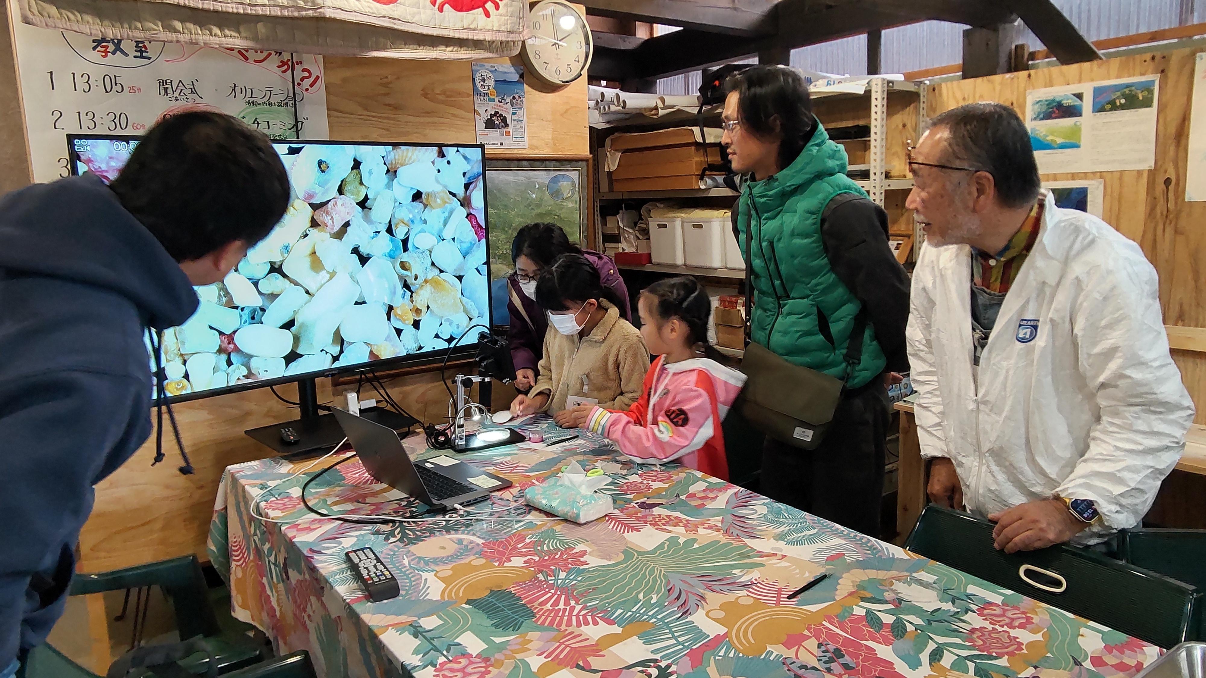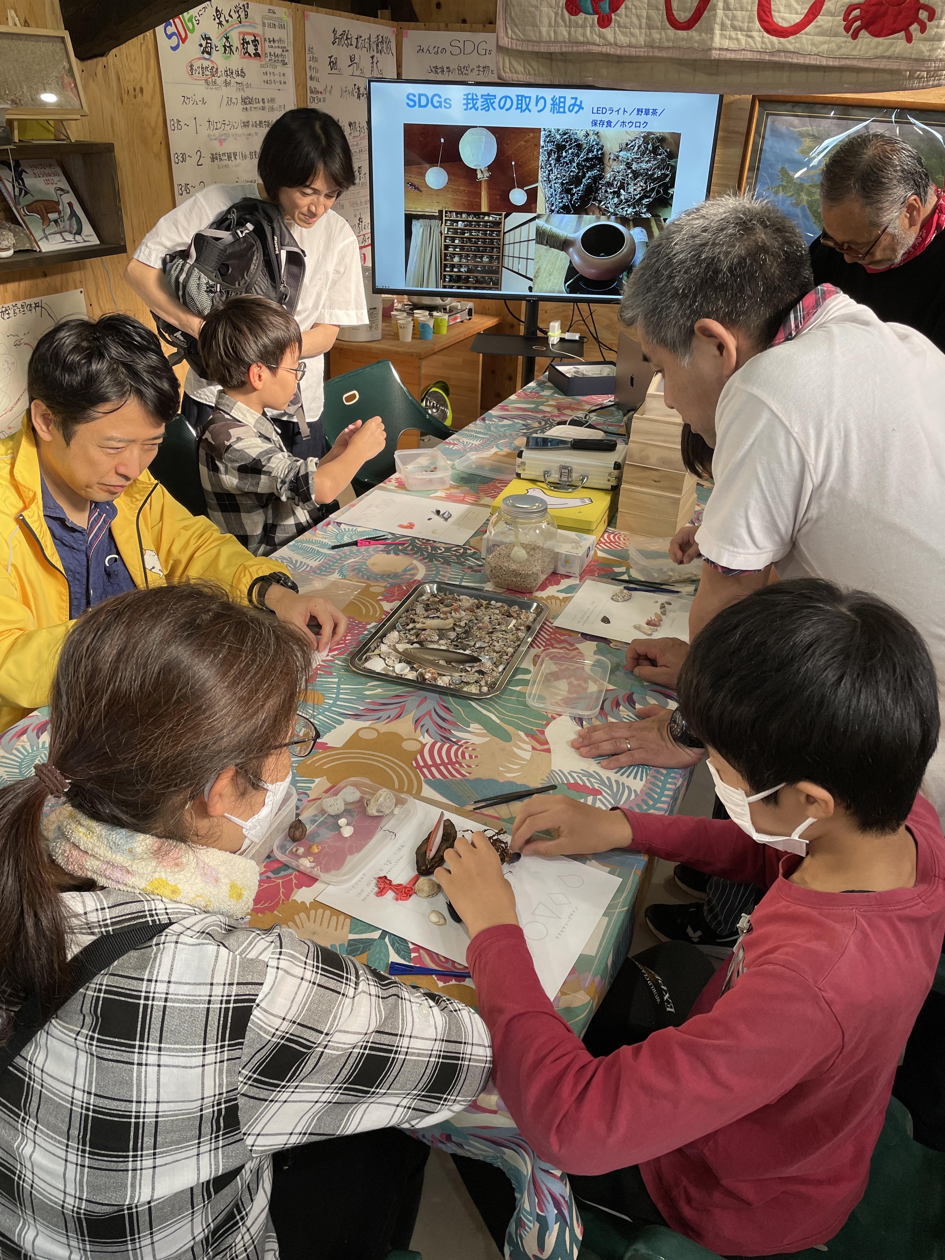 今回も、小波海岸で環境保全活動に取り組まれている任意団体「海の楽校」のご協力のもと、小波海岸の豊かな自然環境を体感。海岸の「砂のようなもの(?)」を顕微鏡で見てびっくり!砂のように小さな、たくさんの種類の微小貝で構成されていることを知り、親子でじっくり観察しました。そのあとは海岸でビーチコーミング。自分たちで見つけたお気に入りの貝殻などを使用し、アクセサリーやジオラマを作成。貝殻だけでなく、抜け殻や海藻を使う子も!それぞれとっても個性的で、見ている大人たちも楽しかったです。